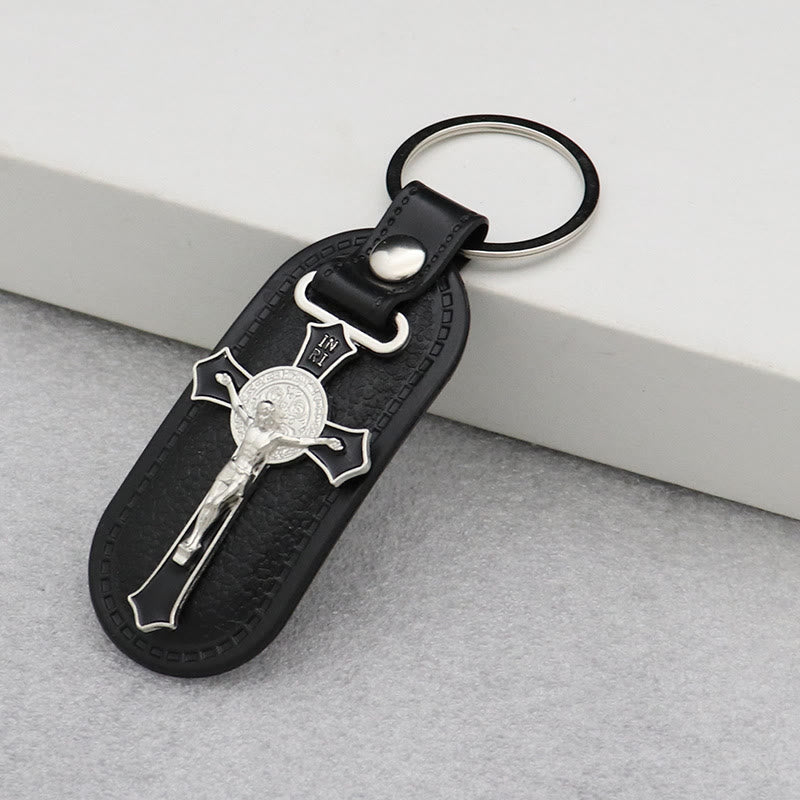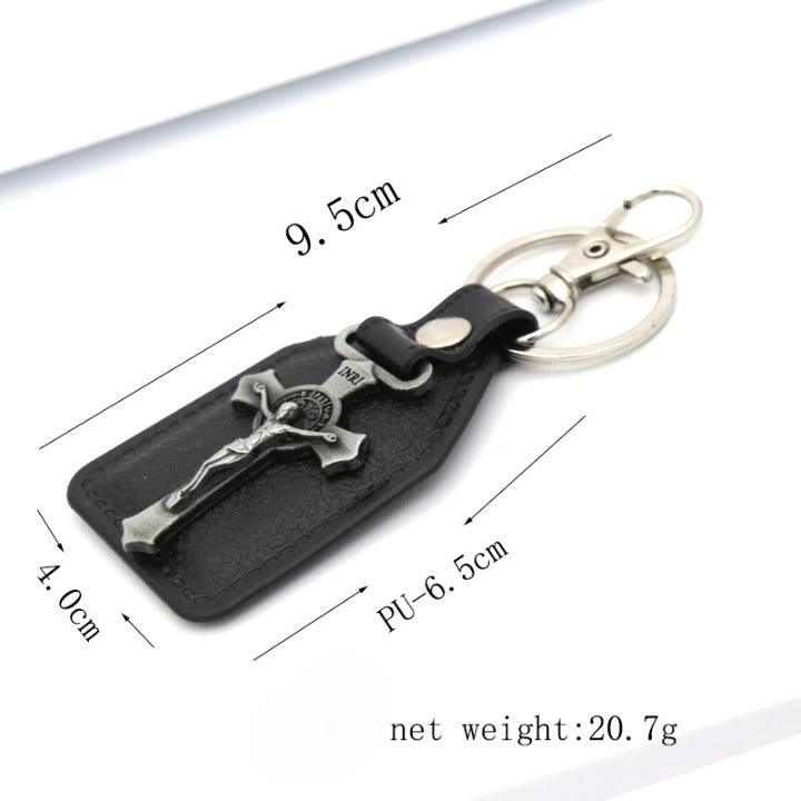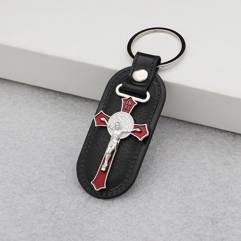 Stylish Colored Crucifix Keychain on Leather: Spiritual Keepsake for Faithful Souls