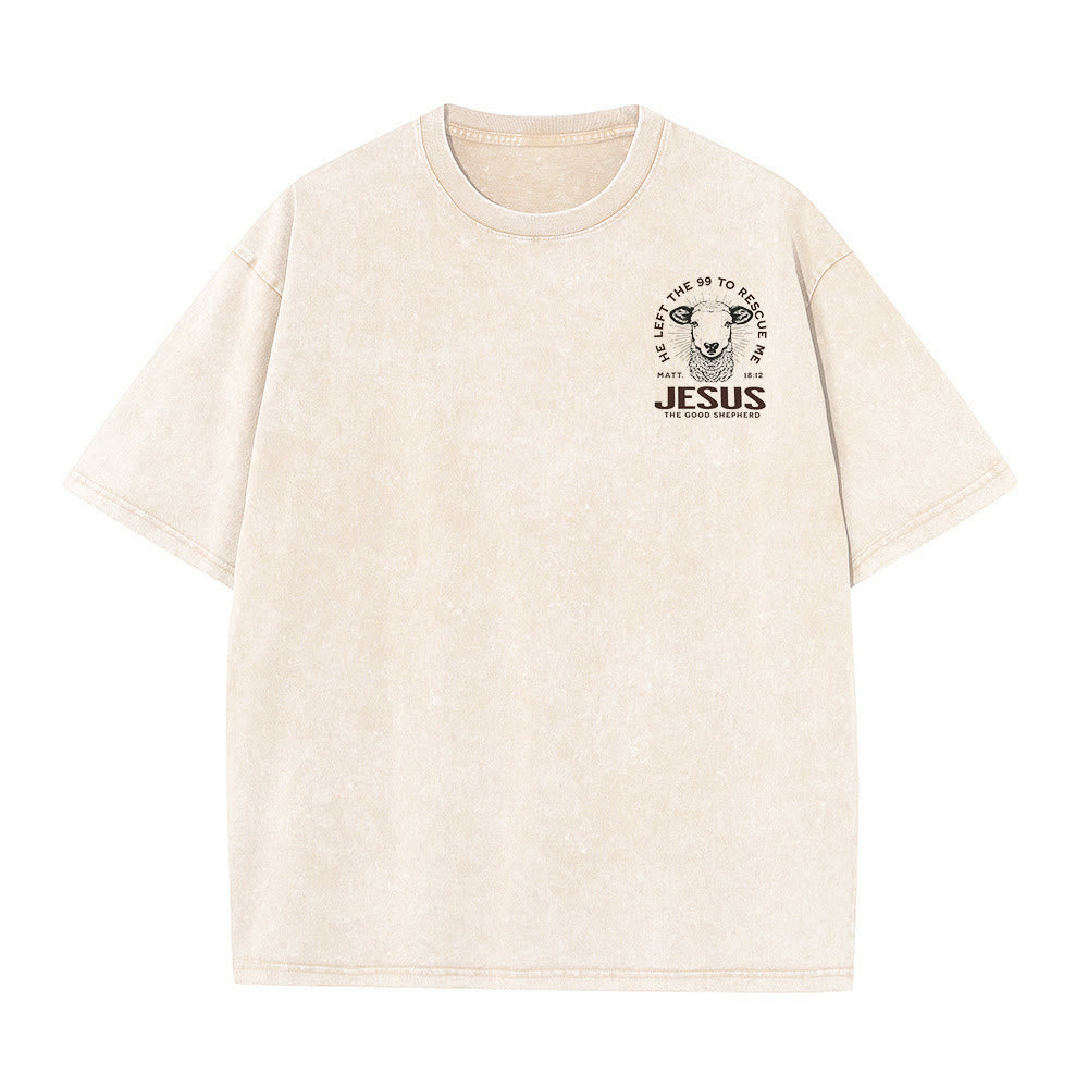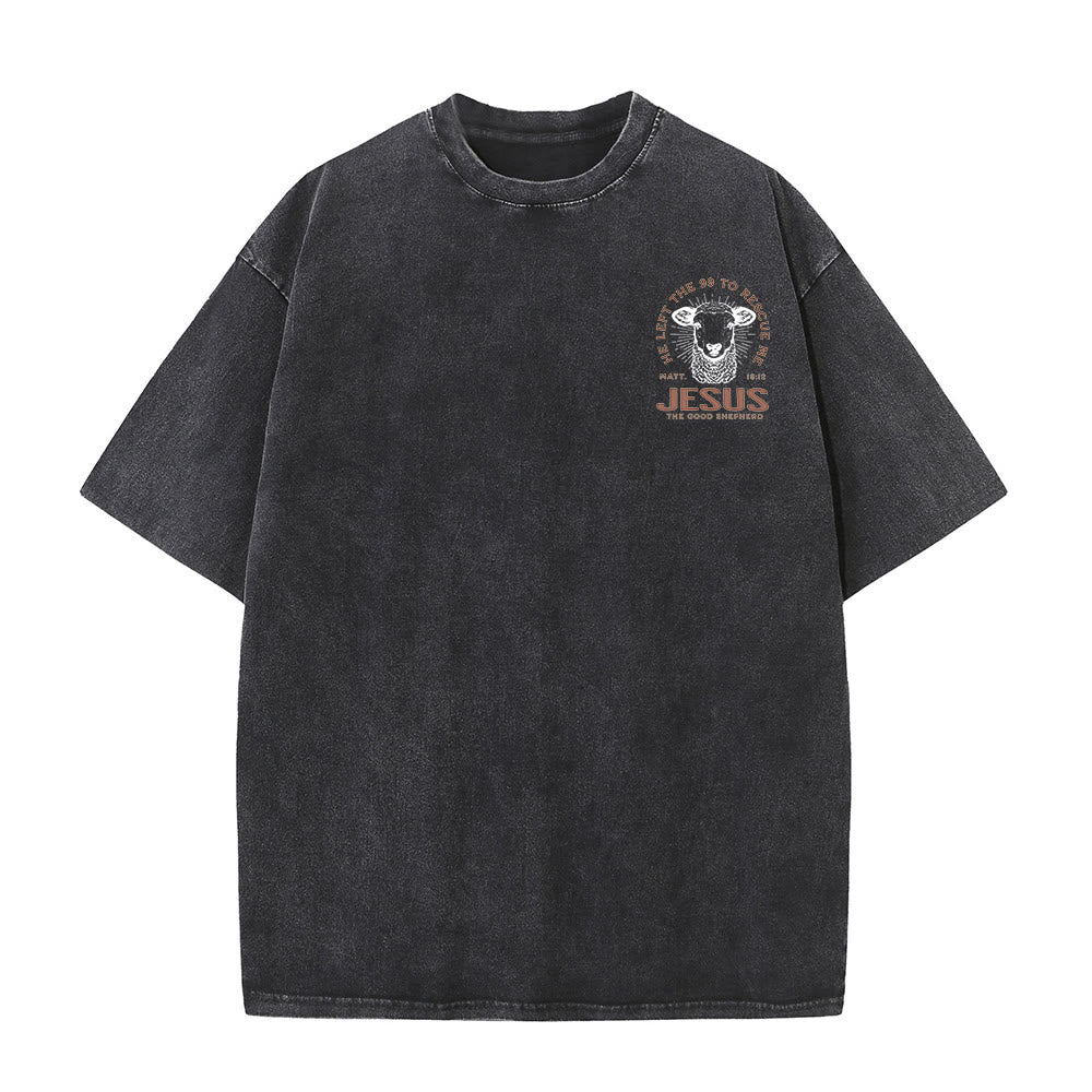 This black, vintage-washed T - shirt is a testament to faith and style. The front features a small, subtle graphic of a sheep's head encircled by the words “JESUS IS THE GOOD SHEPHERD”. The back is where the design truly shines. A detailed sheep's head graphic is surrounded by the inspiring text “HE LEFT THE 99 TO RESCUE ME” from Matt. 18:12. Below, “JESUS THE GOOD SHEPHERD” is emblazoned in bold letters, a powerful reminder of Jesus' care and sacrifice.