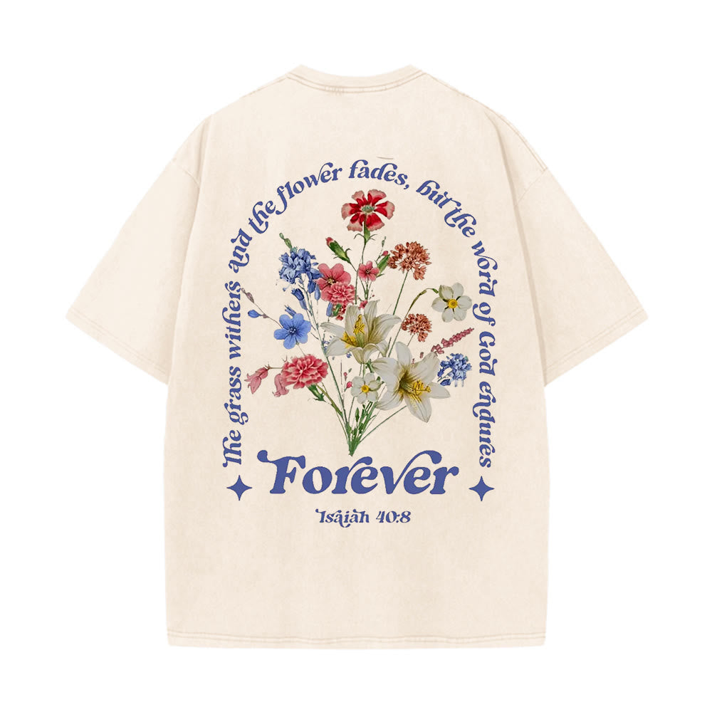 This T - shirt is a beautiful expression of Christian faith. The front features the word "Forever" along with the reference "Isaiah 40:8". Isaiah 40:8 in the Bible states, "The grass withers and the flower fades, but the word of our God will stand forever." This verse emphasizes the eternal and unchanging nature of God's word, contrasting it with the transient nature of worldly things.The back of the shirt showcases a vibrant floral arrangement. The flowers symbolize the transient beauty of the natural world, which, as the verse mentions, withers and fades. In contrast, the word of God endures. Wearing this T - shirt is a way to remind oneself and others of the lasting truth and stability found in God's teachings, and to celebrate the eternal nature of His word in a stylish and meaningful manner.