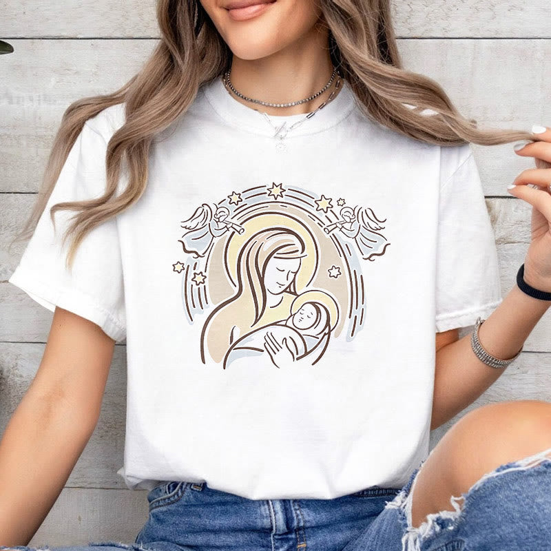 The T-shirt features a tender depiction of the Madonna cradling Baby Jesus, surrounded by an aura of heavenly angels and stars. This artistic representation emphasizes the serene and sacred moments shared between mother and child, radiating warmth and compassion. The design serves as a reminder of the unconditional love and protection provided by the Holy Mother. -