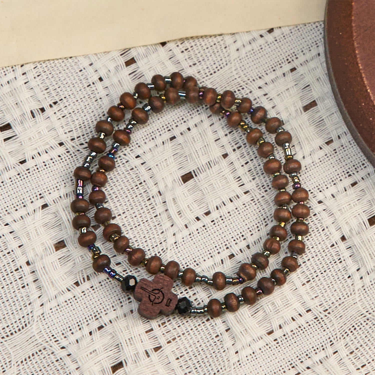 This wooden bracelet grounds your spirit. Smooth, classic beads carry the gentle touch of nature, anchored by a simple cross—a humble yet powerful emblem of devotion. -