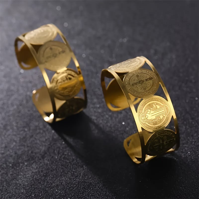 This adjustable cuff bracelet merges the sacred St. Benedict medal (a symbol of protection and grace) with polished metal design — pairing spiritual meaning with refined style to create a wearable, dignified reminder of faith. -
