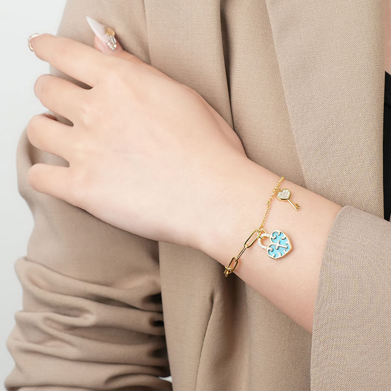 Christianartworkshop Turquoise Cross Heart-Lock Bracelet with Zirconia Key