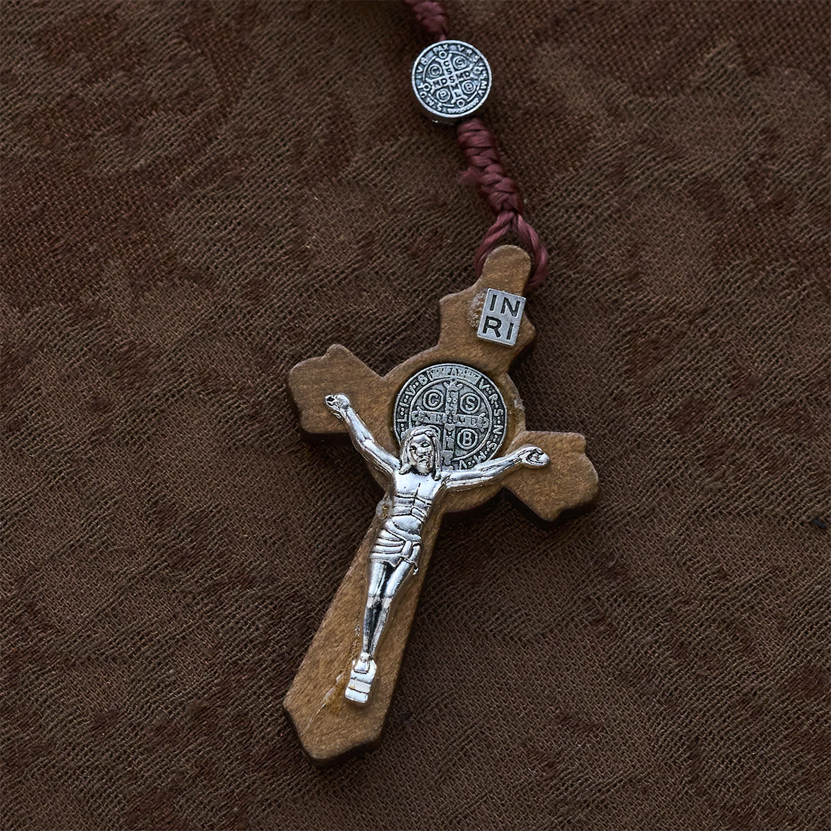 Each bead (earthy or deep-hued) is paired with detailed St. Benedict medals and a sturdy crucifix, woven with care. It blends natural texture with divine symbolism, honoring the rhythm of prayer. -