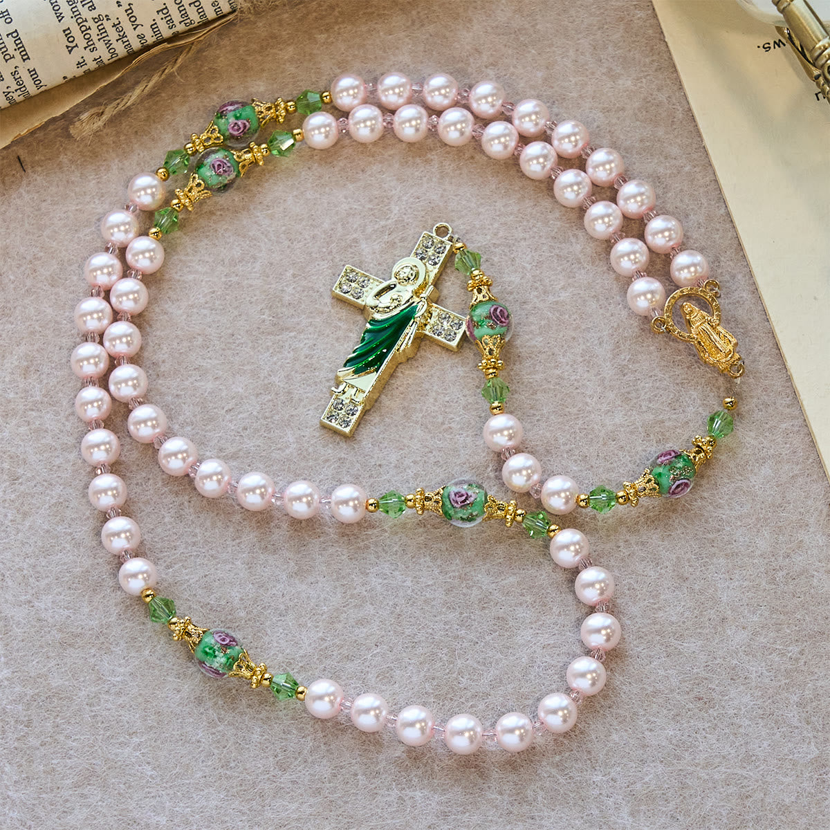 The pink hue mirrors the softness of faith, while the floral beads and St. Jude devotion remind you: even in uncertainty, his intercession (and Christ’s love) stands steady. With each bead, let the charm and sacred meaning guide you to hold fast to hope. -