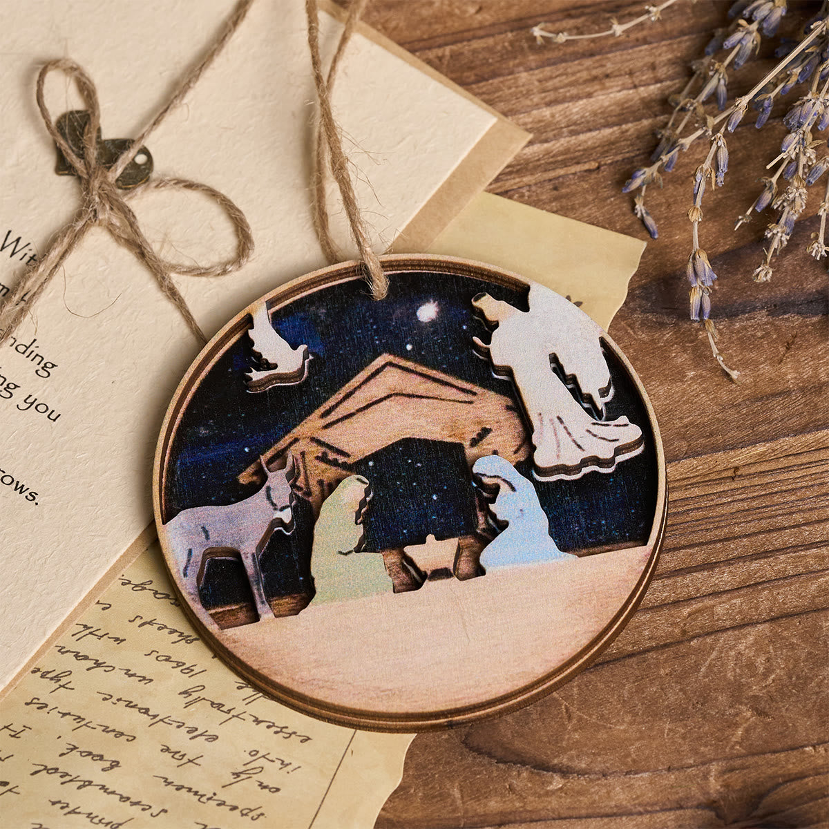 3D Wood Nativity Scene with Angel & Animal Hanging Ornaments