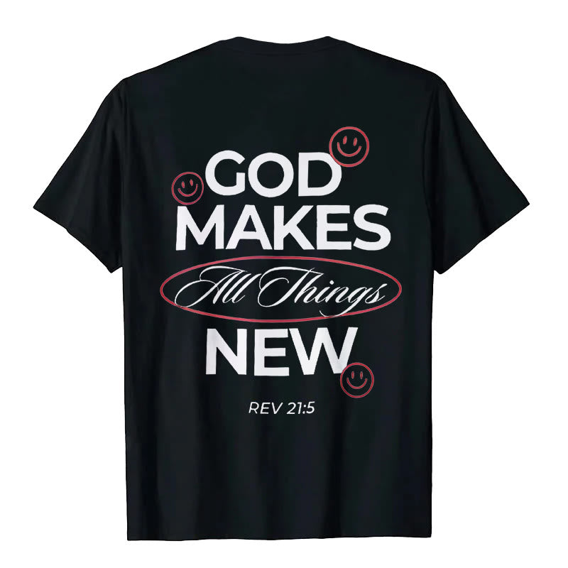 On the back of this T-shirt, the words "GOD MAKES All Things NEW" are eye-catching, paired with a playful smiley face pattern and quoting the verse "Revelation 21:5", conveying the beautiful meaning that God can make all things new, overflowing with positive power and sacred hope.