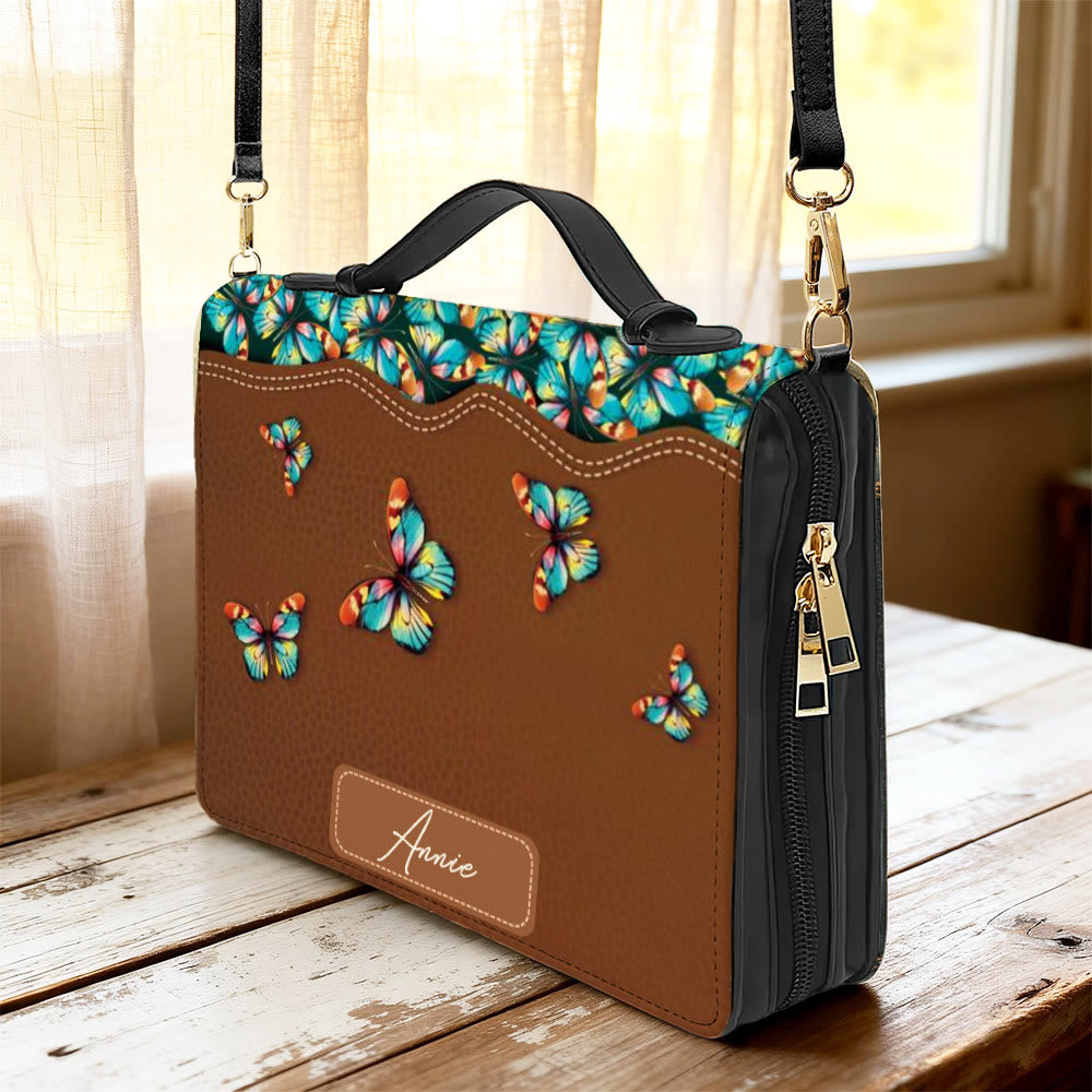 This Bible cover merges a hopeful butterfly motif with the inspiring phrase “LET YOUR FAITH BE BIGGER THAN YOUR FEAR” — pairing bold, uplifting design with a powerful message of spiritual bravery to craft a devoted companion for your sacred text. -