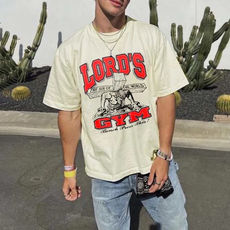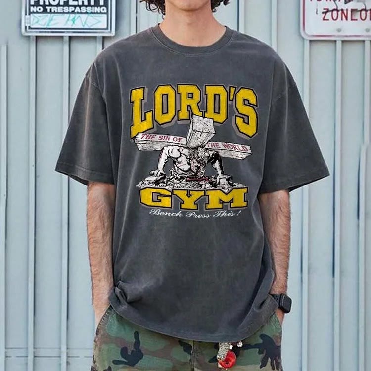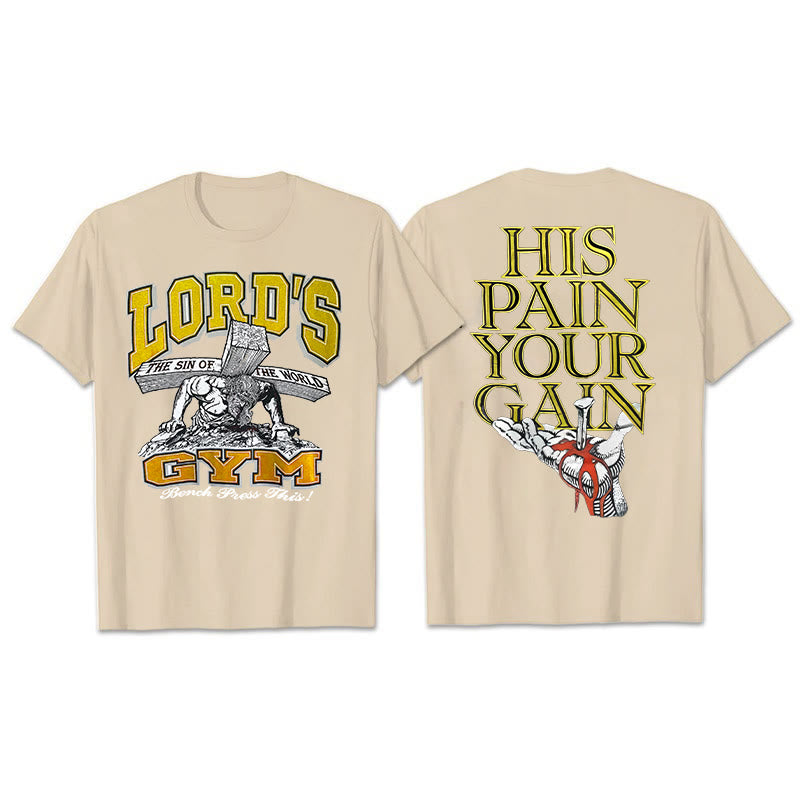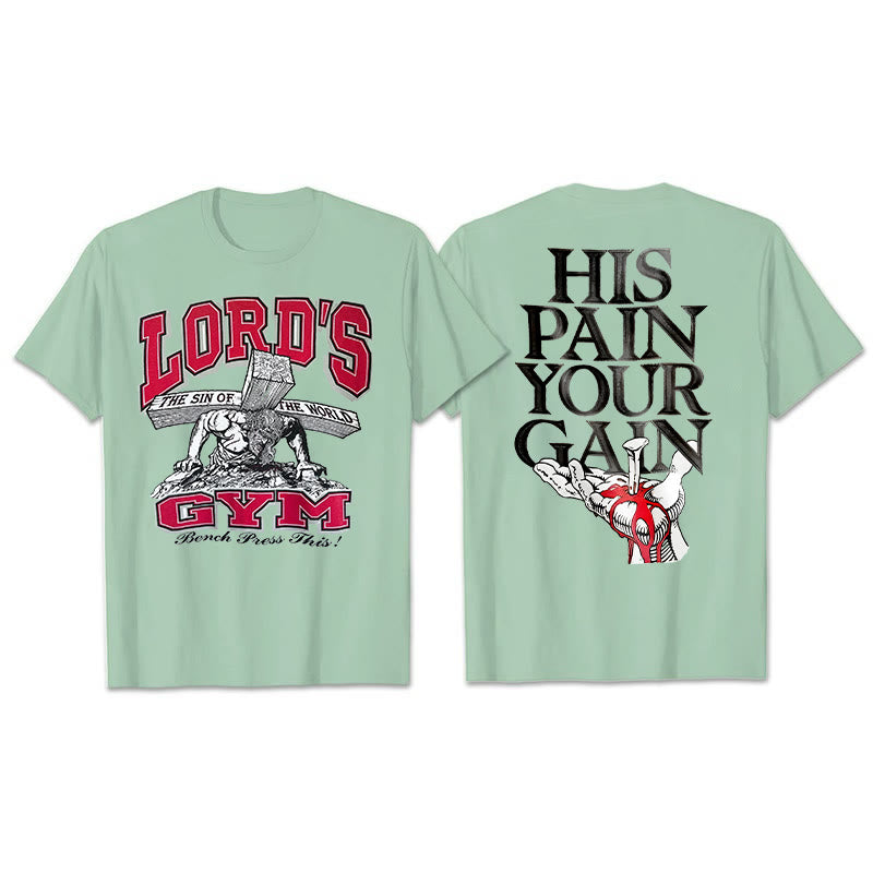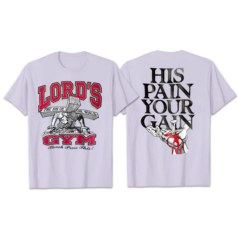On the back of this T-shirt, the striking capital letters "HIS PAIN YOUR GAIN" are presented, conveying the profound doctrine of Jesus Christ's suffering and redemption. In the pattern below, a heart pierced by a nail further strengthens the image of sacrifice and redemption. Wearing it is not only a pious declaration of faith, but also a reminder to ourselves that because of Christ's suffering, we can gain redemption and rebirth, and always remember this sacred grace in our daily lives.