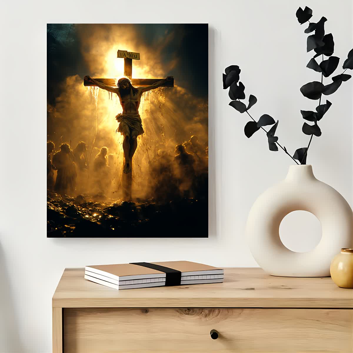 Featuring the crucifixion of Jesus with radiant light and sacred detailing, this art print radiates redemptive devotion and spiritual depth — inviting reflection on Christ’s sacrificial love. -