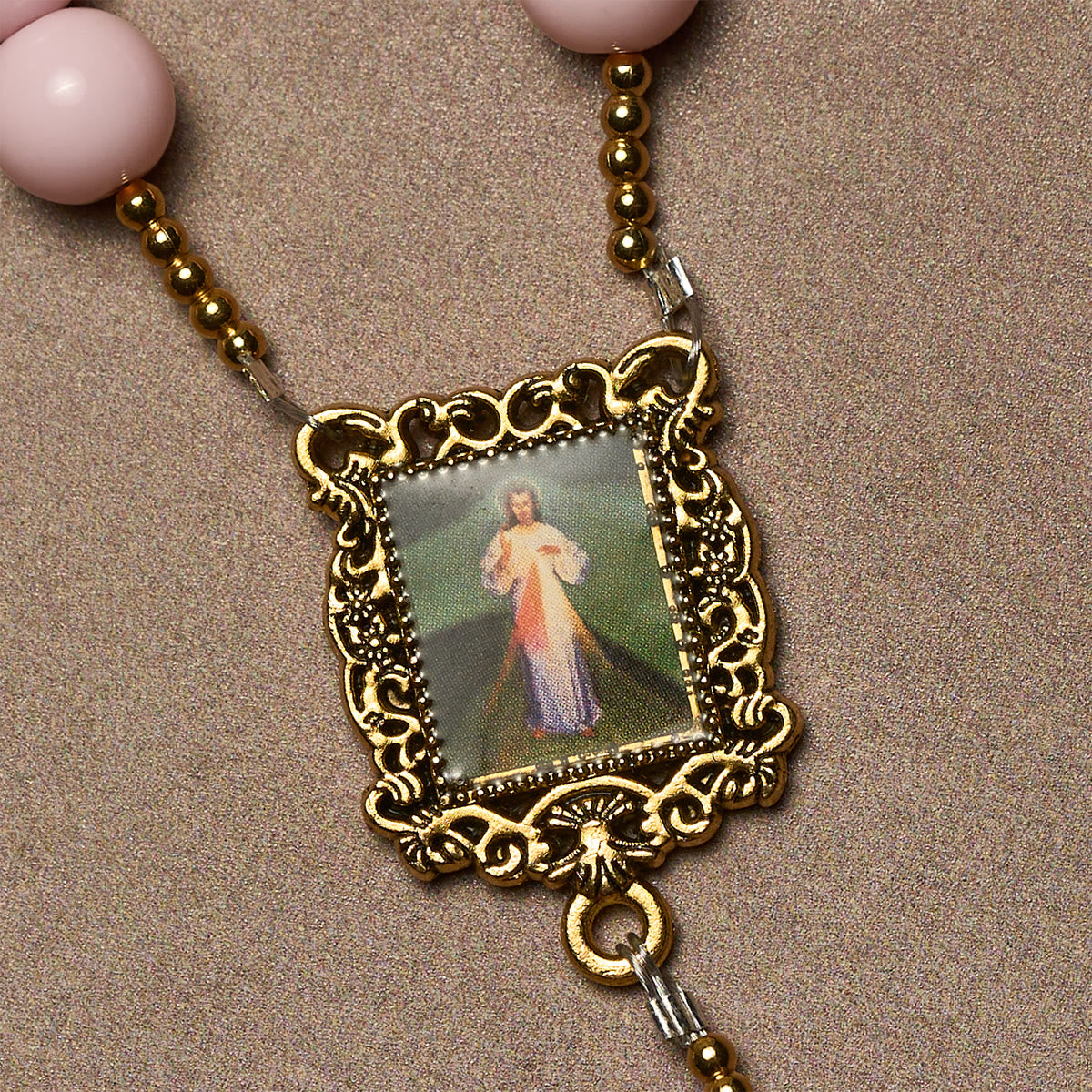 This rosary pairs gentle pink beads with gold accents, centering on an ornate golden crucifix and a small Divine Mercy medal—soft in color yet rich in meaning, inviting calm and reverent devotion. -