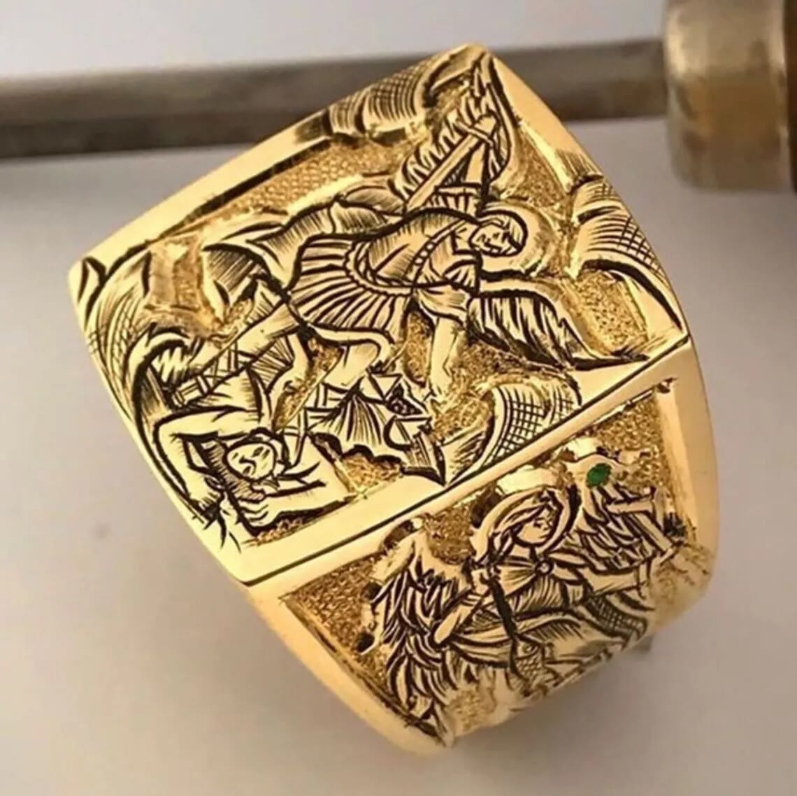 Exquisite Engraving: The ring showcases meticulously detailed engravings of Archangel St. Michael triumphing over evil, highlighting his valor and divine power.