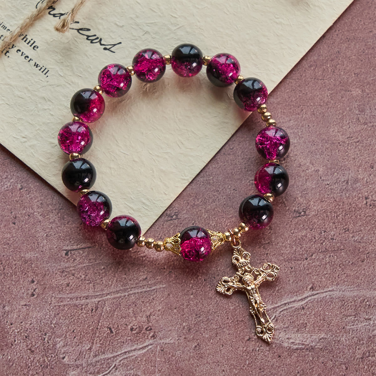 This handcrafted bracelet brings together two divine elements — the depth of faith and the beauty of grace. With black and pink cracked glass beads joined by a radiant golden crucifix, it captures the harmony of devotion: the strength to endure and the love that redeems.