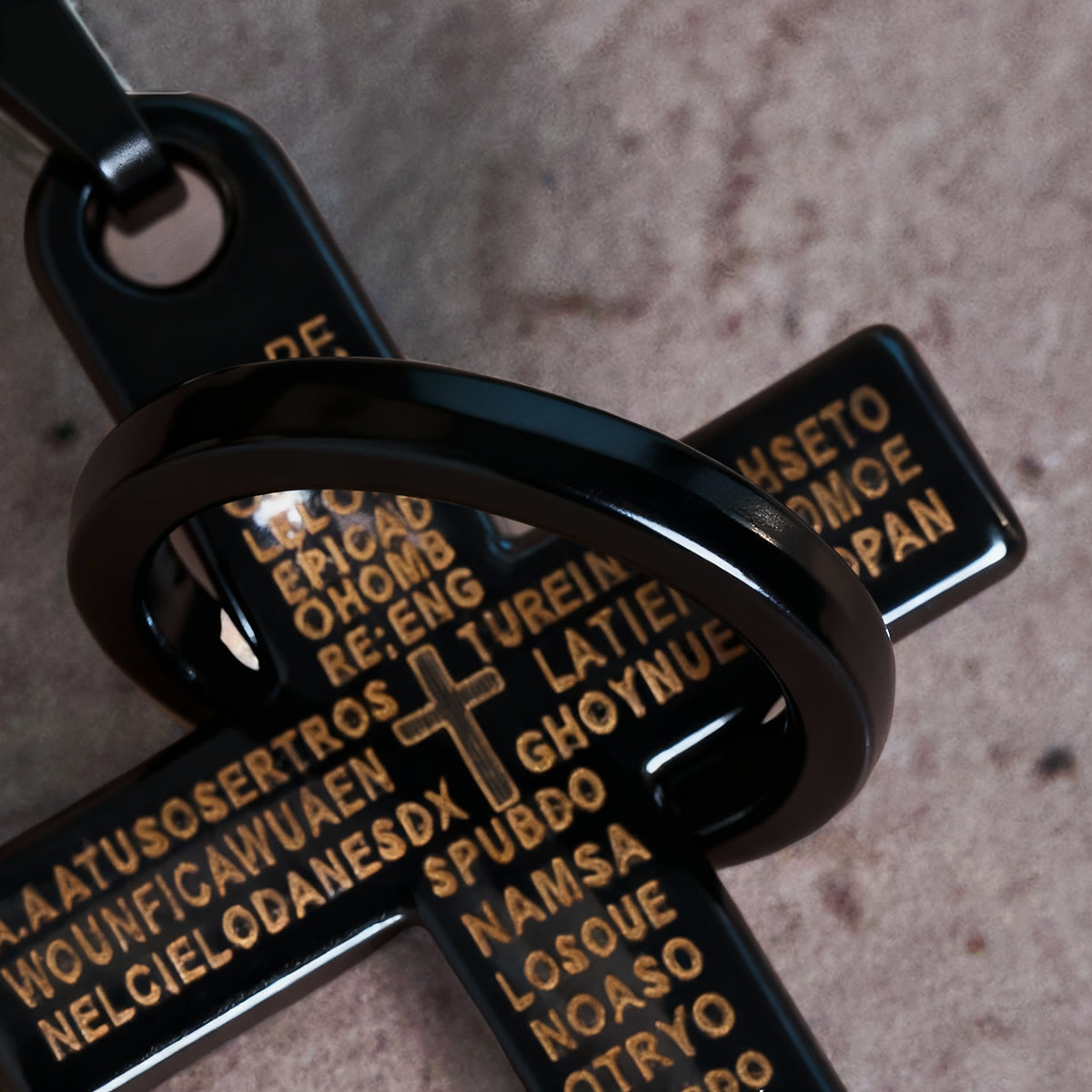 A modern chain holds a cross engraved with the Lord’s Prayer and an interlocking ring that embraces it—style that wears your belief out loud. -