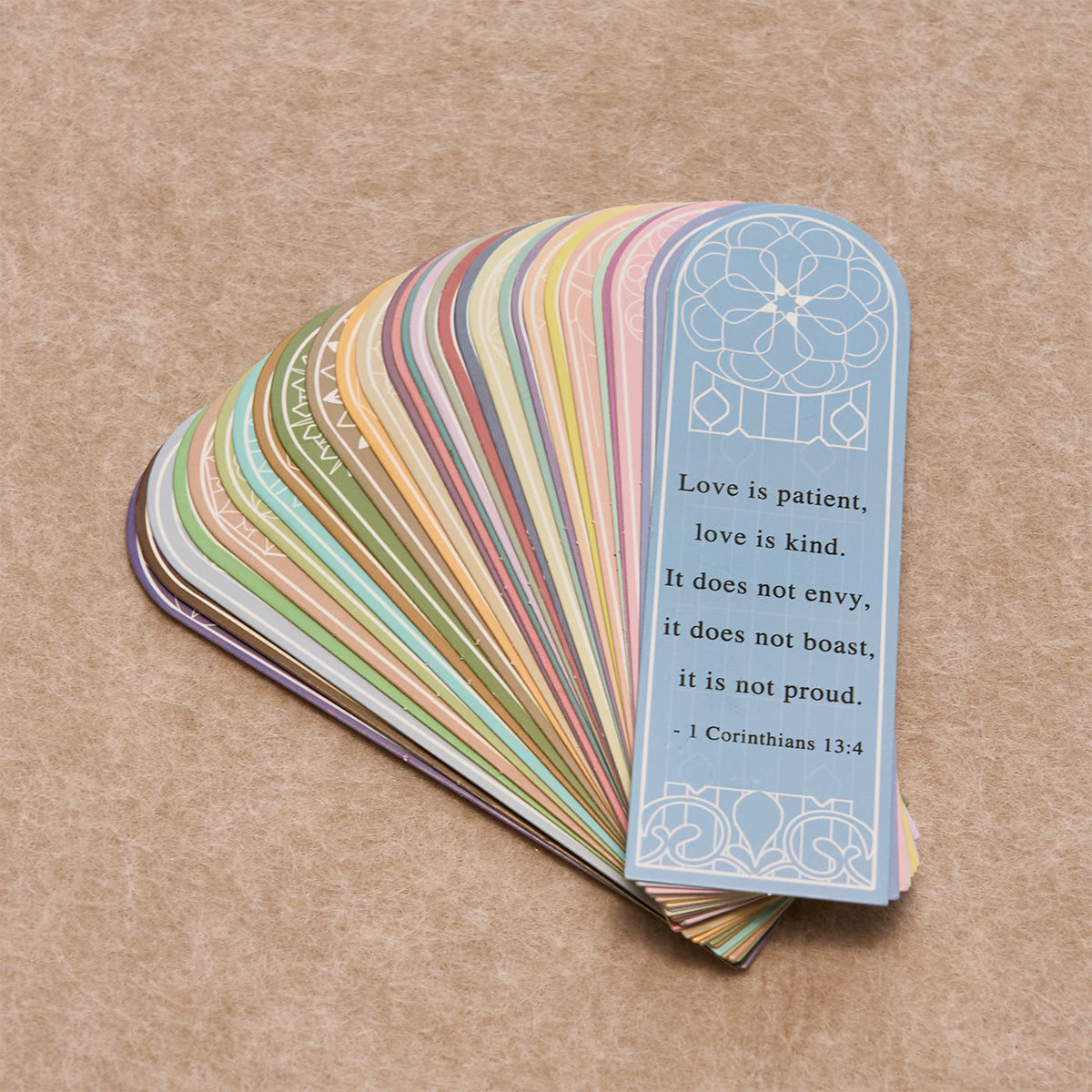 A collection of thirty verses from across Scripture—on love, mercy, courage, hope, and trust—shaped like stained-glass windows. Rotate one each day, slip them into your Bible or journal, or share with friends to keep God’s Word always at hand.