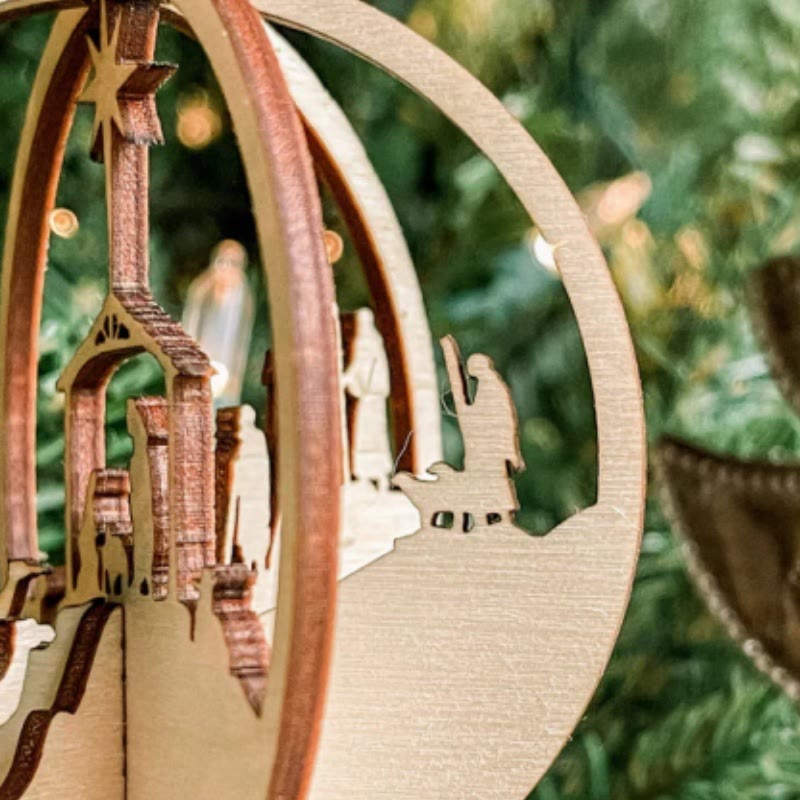 Our ornaments feature intricate depictions of the nativity scene, capturing the holy moment of Jesus’ birth. Each ornament combines natural wood tones with a delicate layer of glitter, symbolizing the light and love of the Christmas season. The timeless silhouettes of Mary, Joseph, and Baby Jesus are framed by stars and angelic figures, offering a reminder of the divine miracle at the heart of Christmas. -