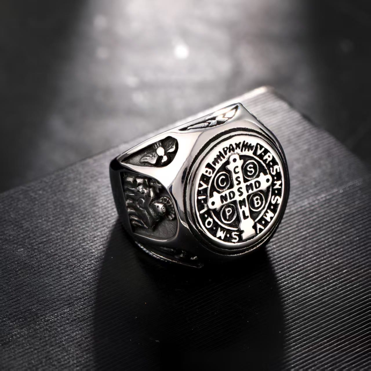 The design of this ring is very distinctive. The main part adopts a retro and tough shape, and the wide ring face gives people a calm and atmospheric feeling. A complex and mysterious combination of symbols is engraved in the center of the ring face. These symbols are arranged in an orderly manner, and the letters and patterns are intertwined, as if telling an ancient and sacred story. In Christian culture, these symbols may have specific religious implications, representing faith, protection and blessings. -