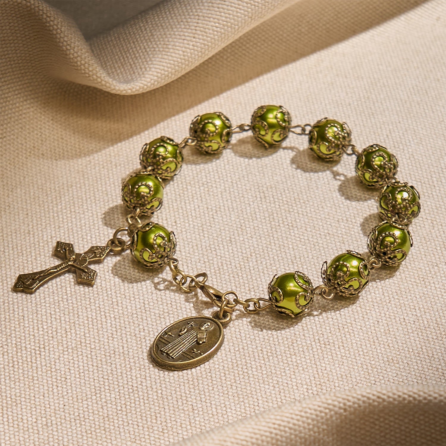 Matte Verdigris Beads with Bronze St. Benedict Medal & Crucifix Bracelet: Find Peace in Subtle Sacredness