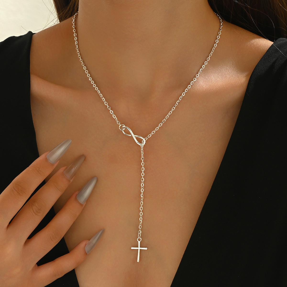 This gold necklace merges the infinity symbol with a cross—crafting a unique spiritual accessory that wraps enduring devotion in subtle, elegant design. -
