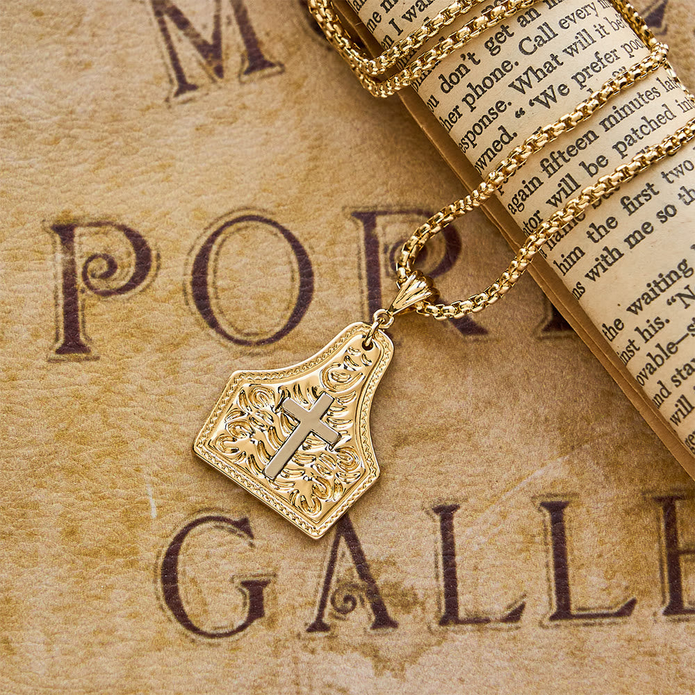 This cross pendant necklace (offered in two colors) merges an ornate, detailed design with a central cross — pairing classic style with the quiet weight of belief to craft a wearable reminder of His love. -