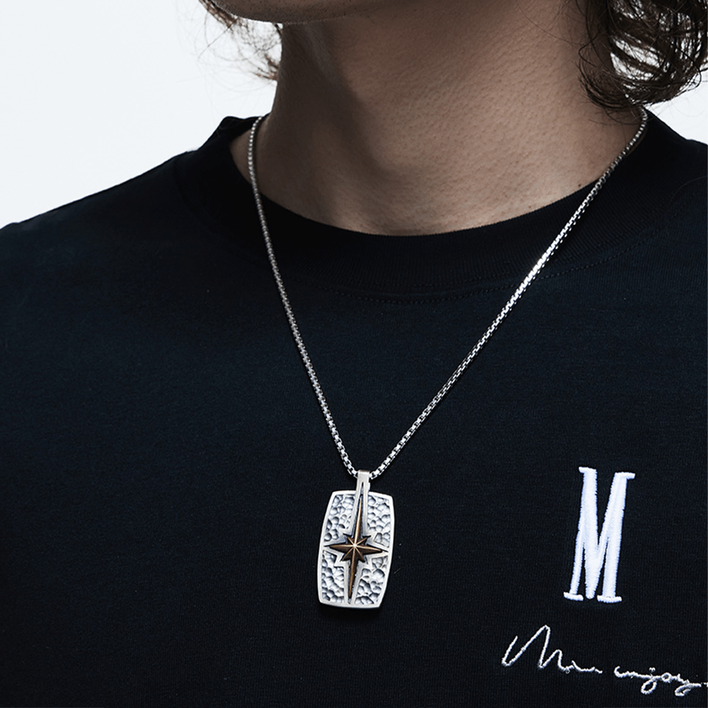 Inspired by the Star of Bethlehem, this pendant features a striking design with intricate details. The star radiates from a hammered textured background, adding depth and a touch of antiquity.