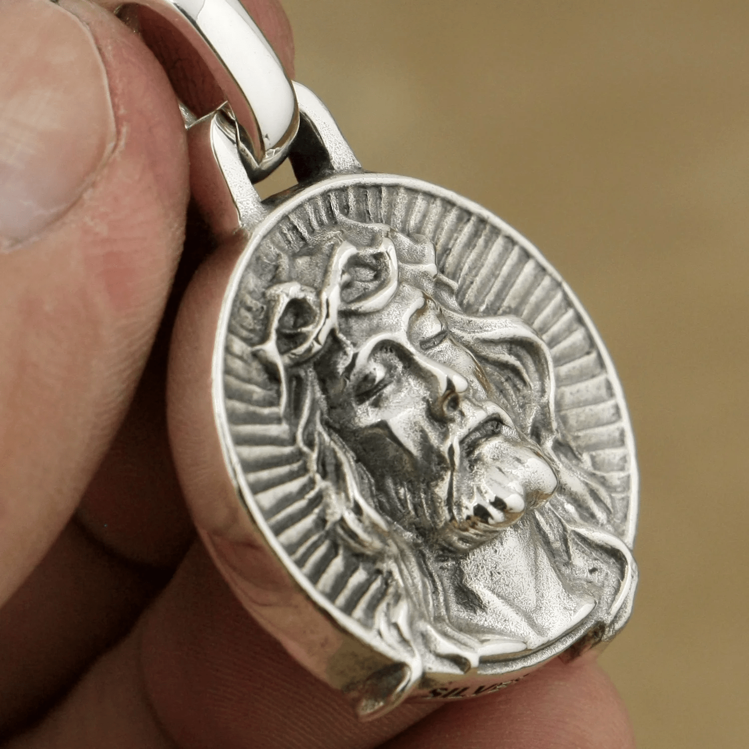 This powerful necklace captures the solemn expression of Christ crowned with thorns—His eyes closed, head gently tilted, surrounded by rays of divine light. -