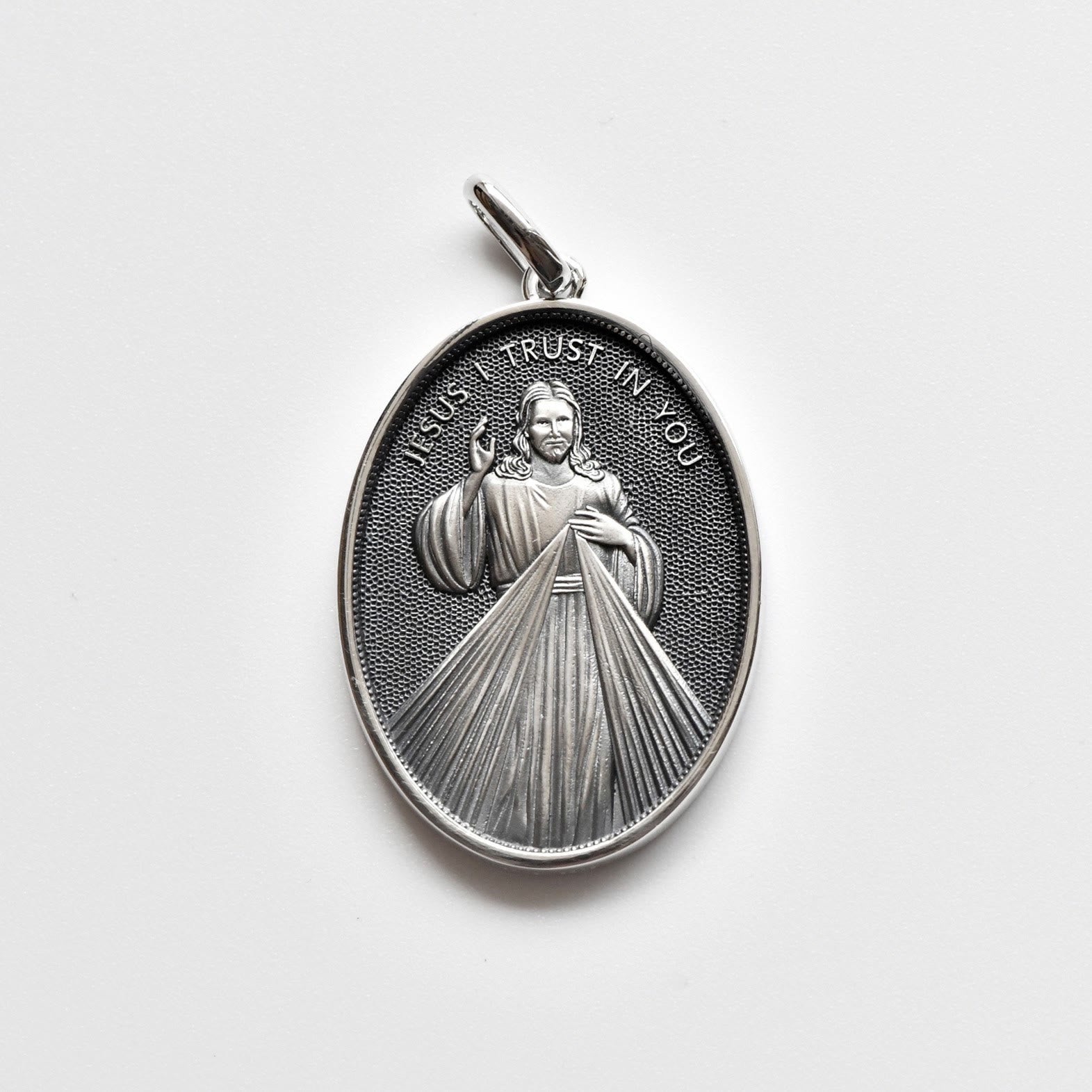 Antique Style Sterling Silver Antique Divine Mercy Jesus Oval Medal Necklace
