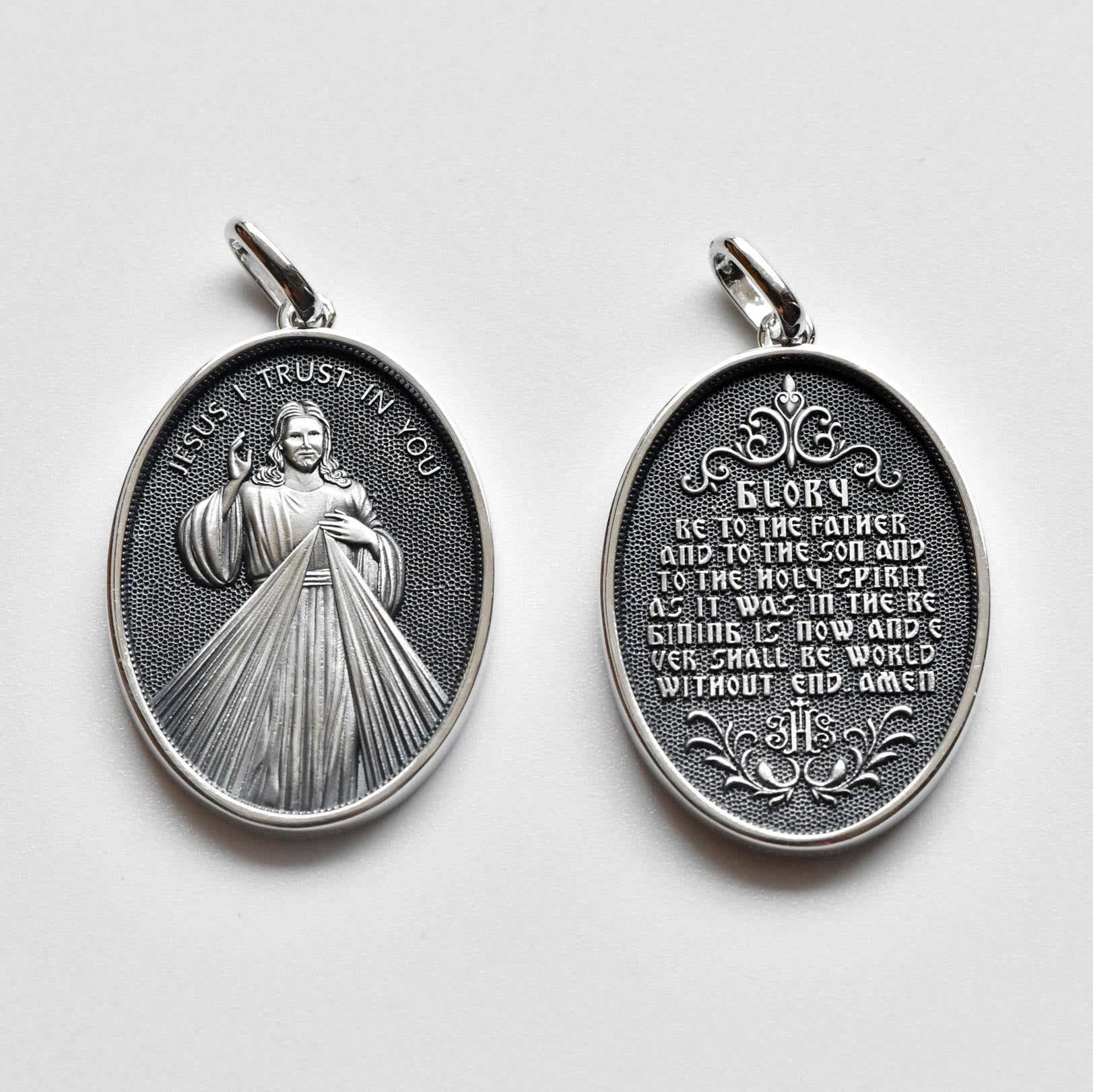 Christianartworkshop Antique Style Sterling Silver Antique Divine Mercy Jesus Oval Medal Necklace - image 1