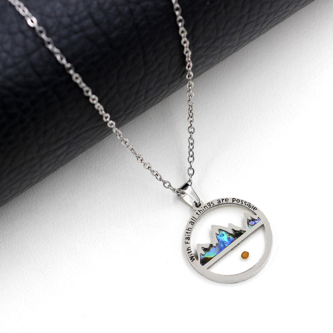 Elegant Design: This round pendant showcases a beautiful mountain range design with iridescent accents and a mustard seed encapsulated at the bottom, symbolizing faith and endless possibilities. The inscription "With Faith all things are possible" around the outer edge reinforces its inspiring message.