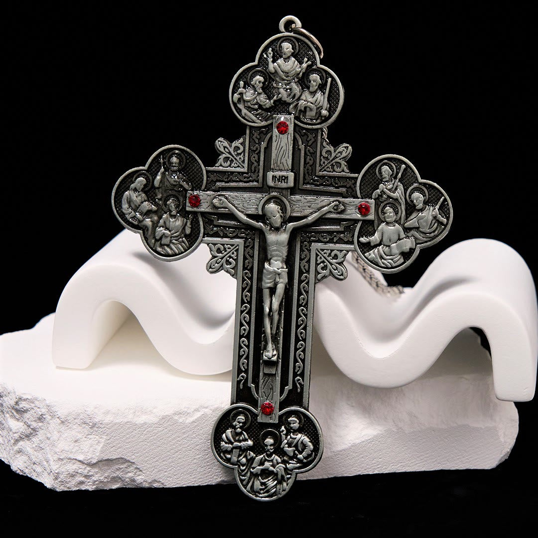 Classic Style Ornate Crucifix with All Saint Iconography & Red Gems Accents Pendant Necklace