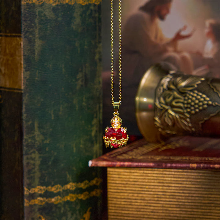 The necklace features a beautifully detailed sacred heart, wrapped in a crown of thorns and aflame, representing Christ’s eternal love and passionate devotion to humanity. The vibrant red heart crystal gleams with life, while the gold elements add a touch of divine elegance, making it a powerful statement of faith. -