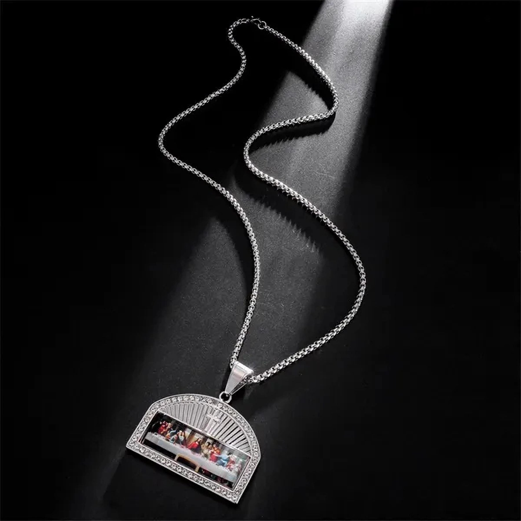 This arch–window pendant frames a vivid Last Supper scene beneath a radiant sunburst and cross—like keeping the sanctuary close to your chest. The jeweled border lifts the moment of Christ’s gift of Himself into a luminous act of devotion. -