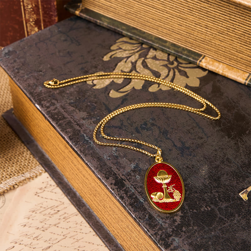 The necklace boasts a stunning pendant depicting the Eucharistic chalice, host, wheat, and grapevine—symbols of Christ’s body and blood. These elements are intricately detailed in gold-tone against a vibrant red or blue enamel background, creating a striking contrast that emphasizes its sacred significance. -
