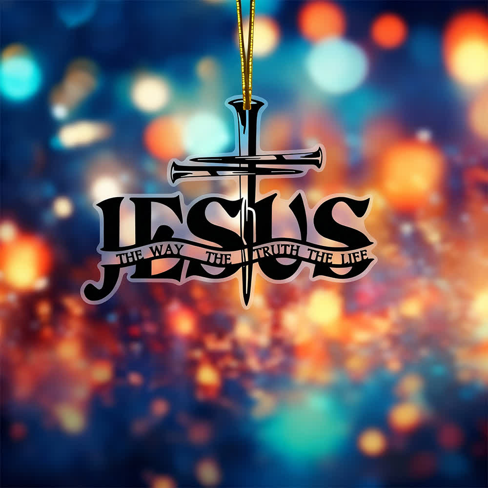 This car ornament features a distinctive nail-shaped cross, integrated with the bold “JESUS” lettering and the scripture “THE WAY THE TRUTH THE LIFE”. -