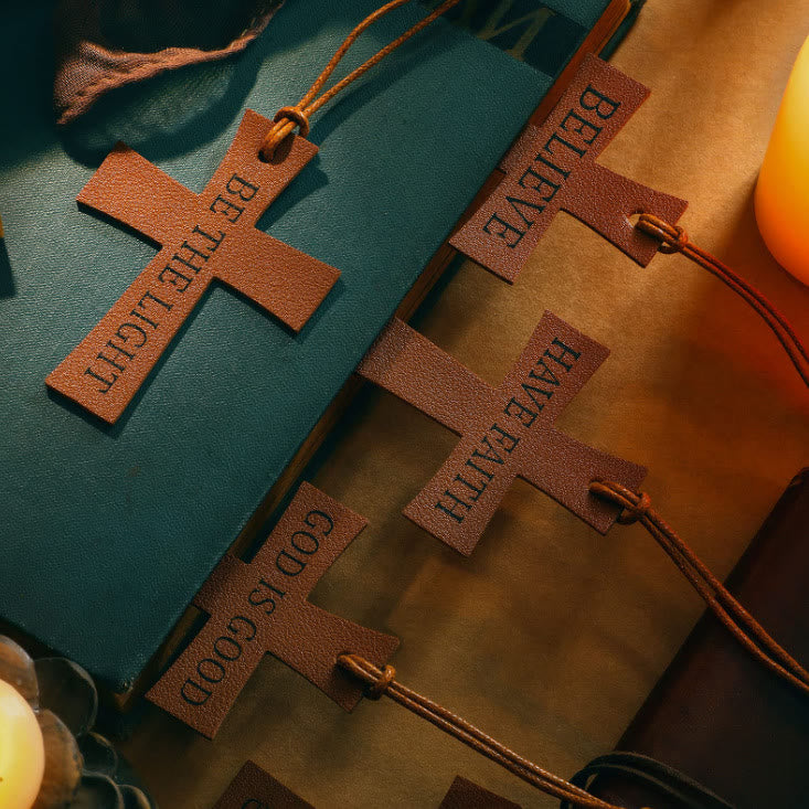 These cross-shaped leather bookmarks merge meaningful phrases, soft tassels, and natural texture — pairing spiritual warmth with rustic charm to create soothing companions for reading moments. -