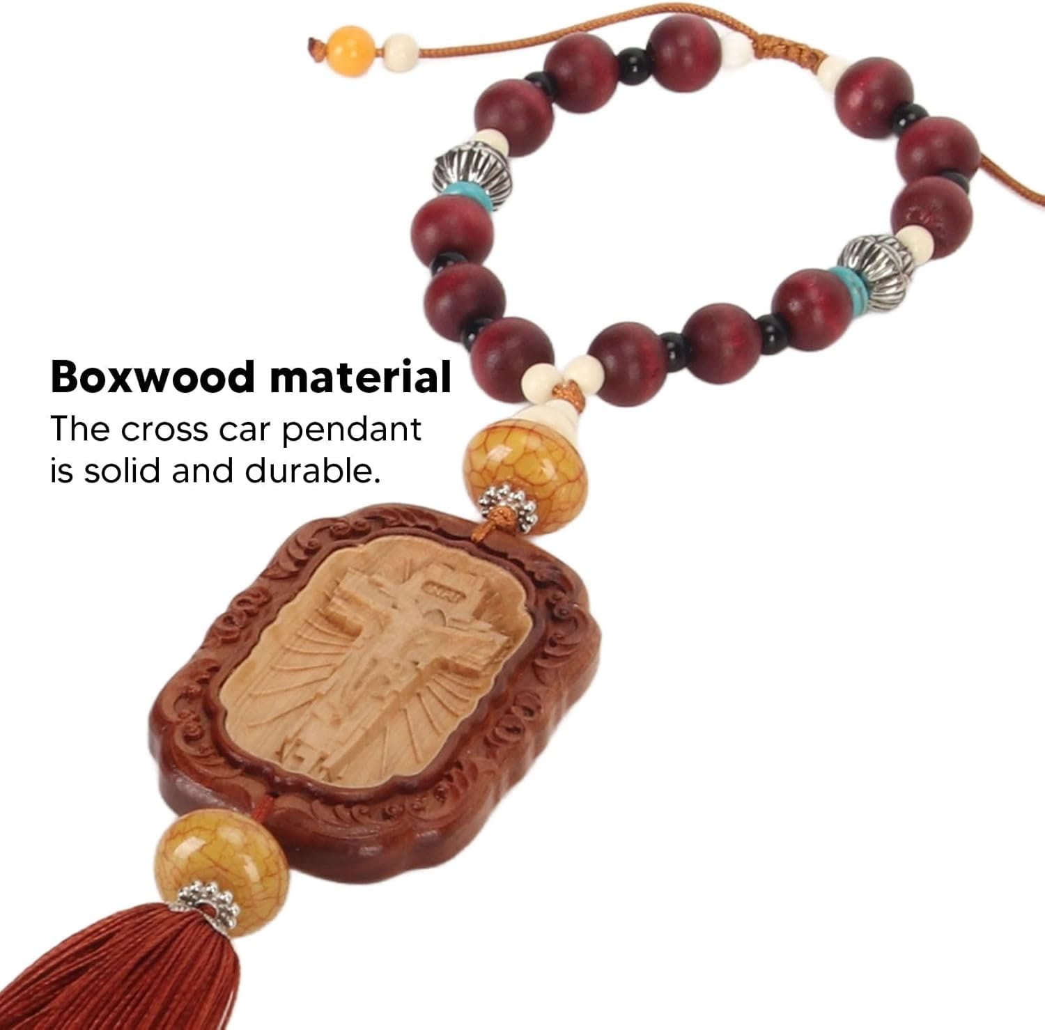 Classic Style Boxwood Crucifix Sign Tassels Car Rearview Mirror Hanging Ornament