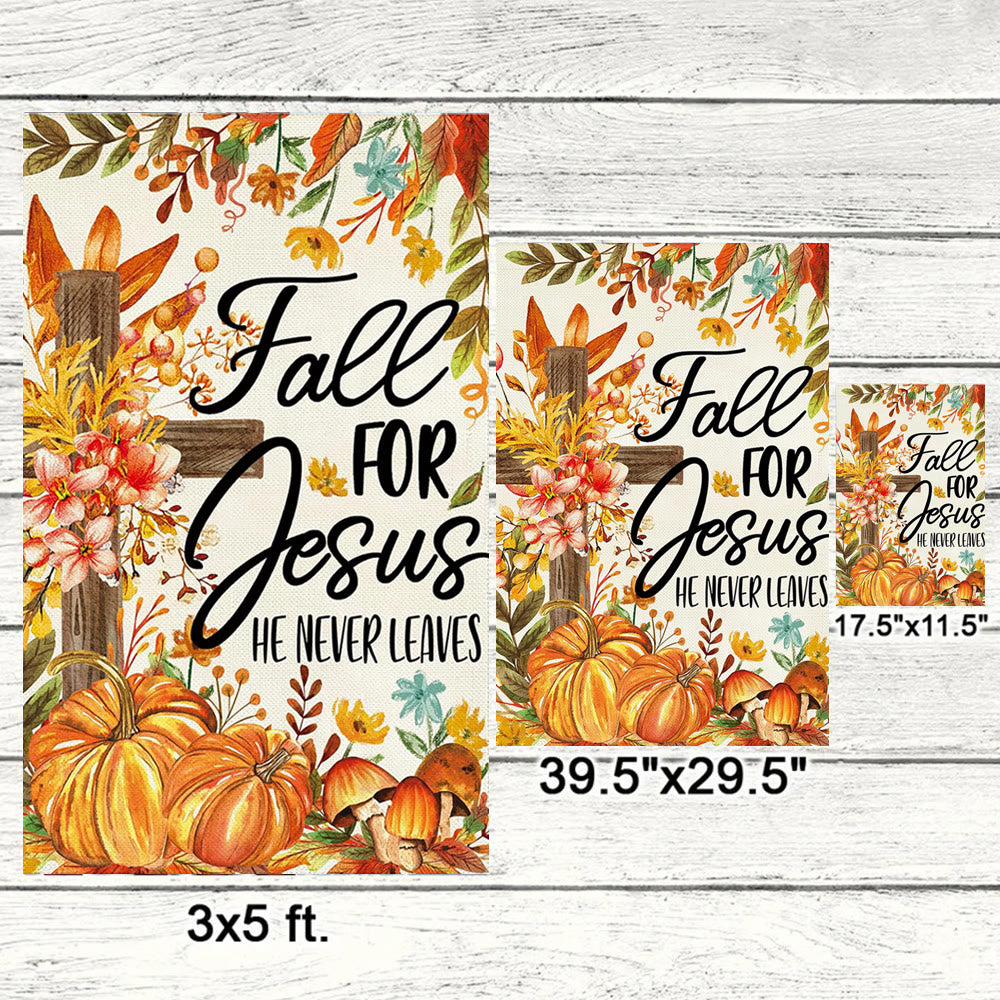 Celebrate the beauty of fall and the steadfastness of faith with this exquisitely designed garden flag, featuring the uplifting phrase “Fall for Jesus He Never Leaves”—paired with warm autumnal motifs like pumpkins, vibrant fall foliage, red cardinals, and a wooden cross -