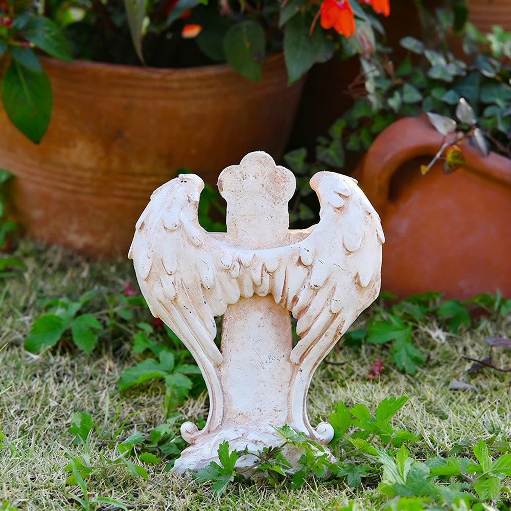 This winged cross statue (adorned with “Mercy, Peace, Love” and the verse “Be yours in Abundance” from 1 John 1:2) merges sacred symbolism with gentle hope. Its angel-winged cross, dove imagery, and heartfelt phrases pair to create a quiet reminder of His grace in daily spaces. -