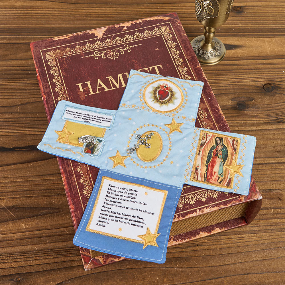 Our hand - crafted, cross - shaped devotional fabric keepsake is a labor of love, meticulously designed to enshrine the sacred. Adorned with intricate golden embroidery, it frames images of the Virgin Mary and Child, Jesus, and sacred medals. Prayers are carefully inscribed, inviting the faithful to engage in heartfelt communication with the divine. When folded, its compact form makes it a portable testament to one's beliefs, a precious keepsake that can be carried close to the heart. -