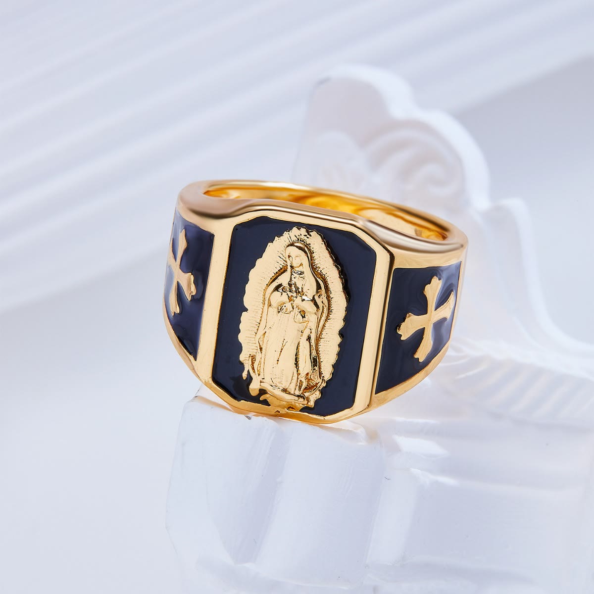 This stunning ring is crafted with meticulous attention to detail, featuring a rich gold finish that exudes sophistication and elegance. The striking contrast of black enamel highlights the central figure of the Blessed Virgin Mary, creating a visually captivating piece that stands out with both grace and reverence.