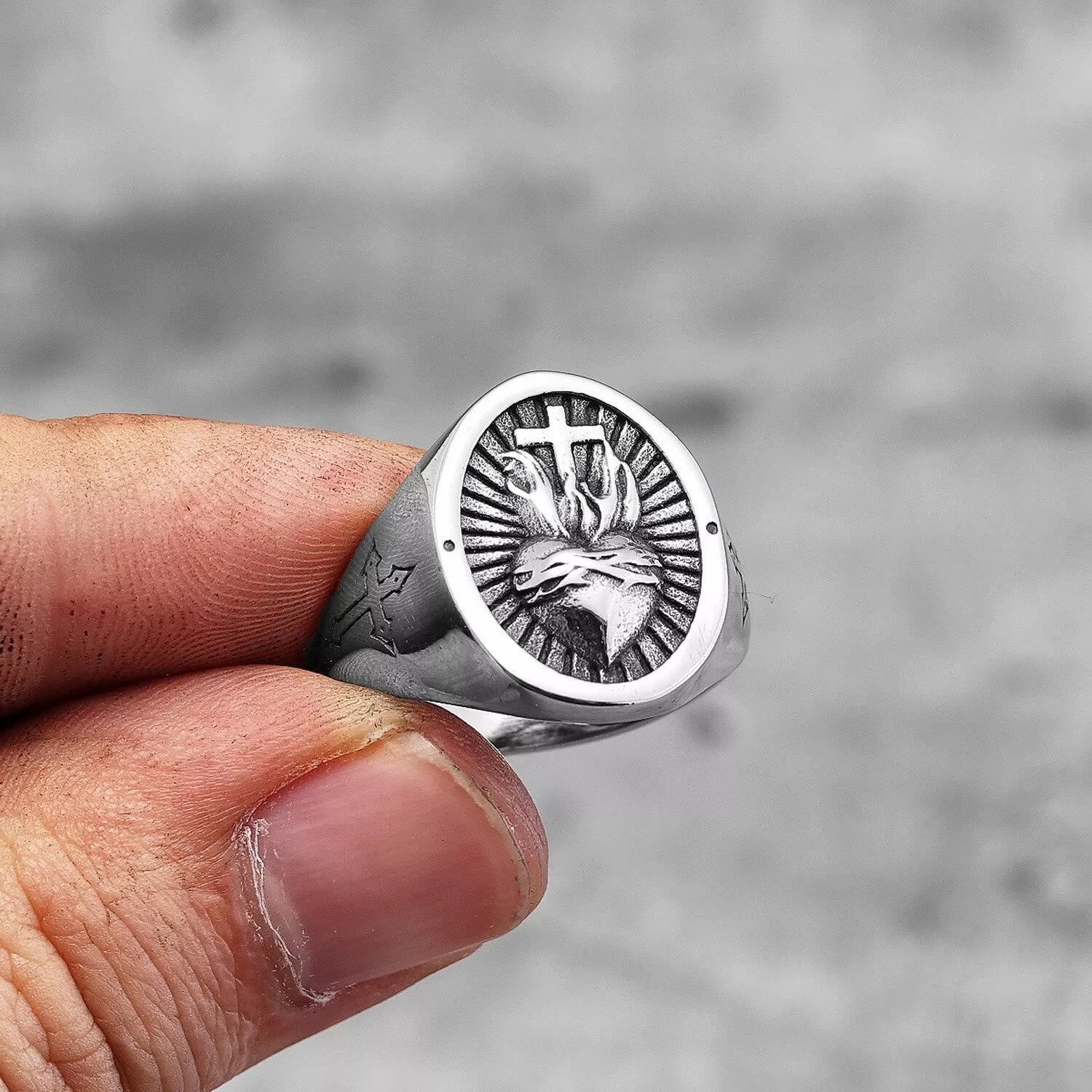 This bold signet band turns daily wear into a devout statement—Sacred Heart relief, cross details, silver tone. Timeless, a symbol of unwavering faith. -
