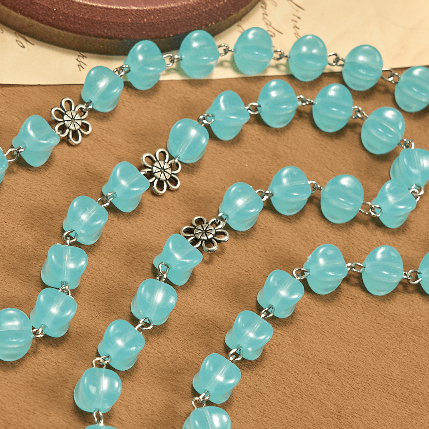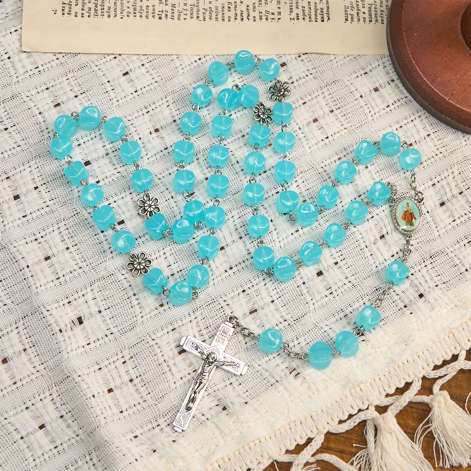 Rose Alloy Chain Blue Cube Beads Rosary with Our Lady Icon & Crucifix: Embrace Divine Elegance