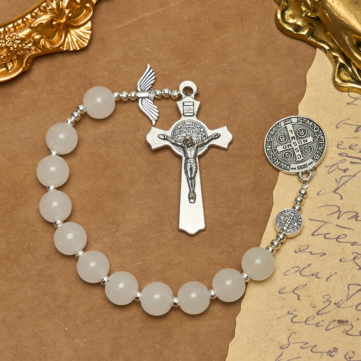 The white crystal reflects the clarity of faith, the St. Benedict symbols anchor devotion to his powerful intercession, and the angel wing wraps each bead in gentle, heavenly care. With every bead, let it guide you: your prayers are wrapped in a faith as pure as the crystal’s glow, as steady as St. Benedict’s protection. -