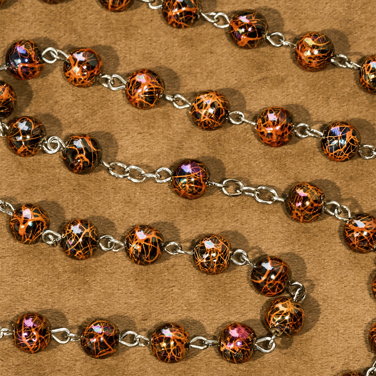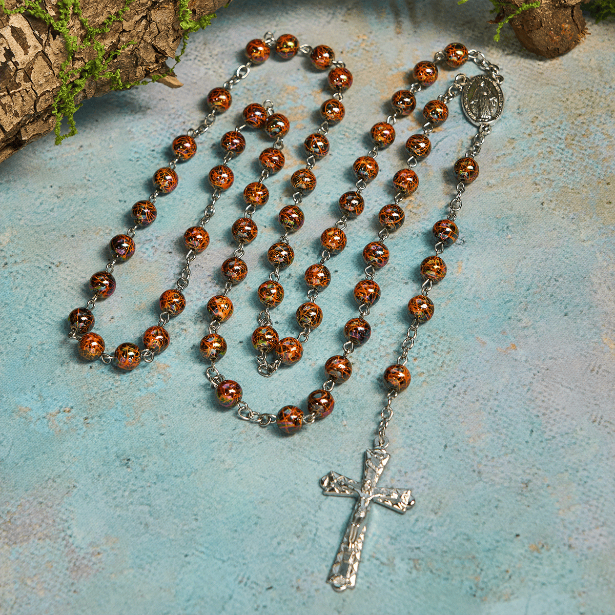 This strand merges shimmering acrylic beads with sacred motifs and a detailed cross — pairing spiritual warmth with luminous style to create a soothing companion for daily moments. -