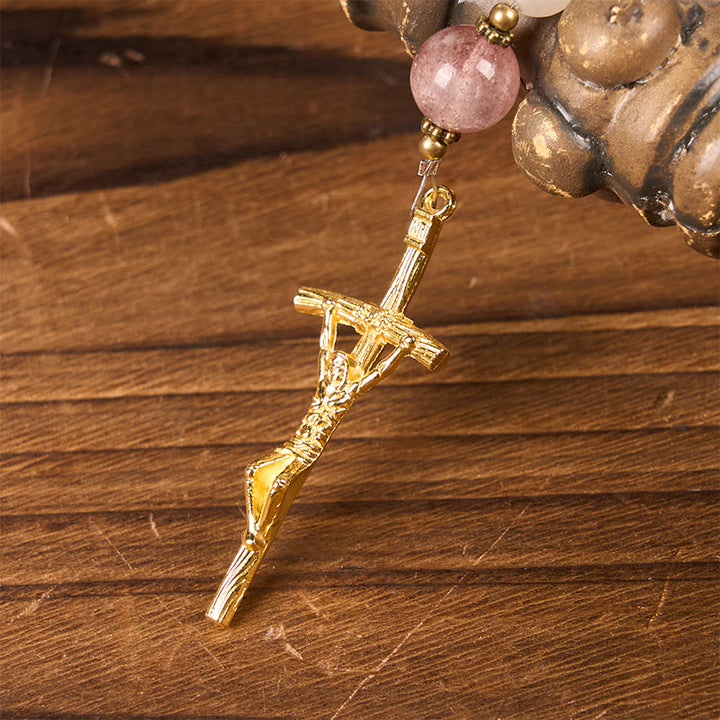 The Handcrafted Rosary with Pink Aventurine and Strawberry Quartz is not just a prayer tool, but a cherished heirloom that enhances the sanctity of your religious practices. Its soothing tones and high-quality materials provide both aesthetic pleasure and soulful comfort.