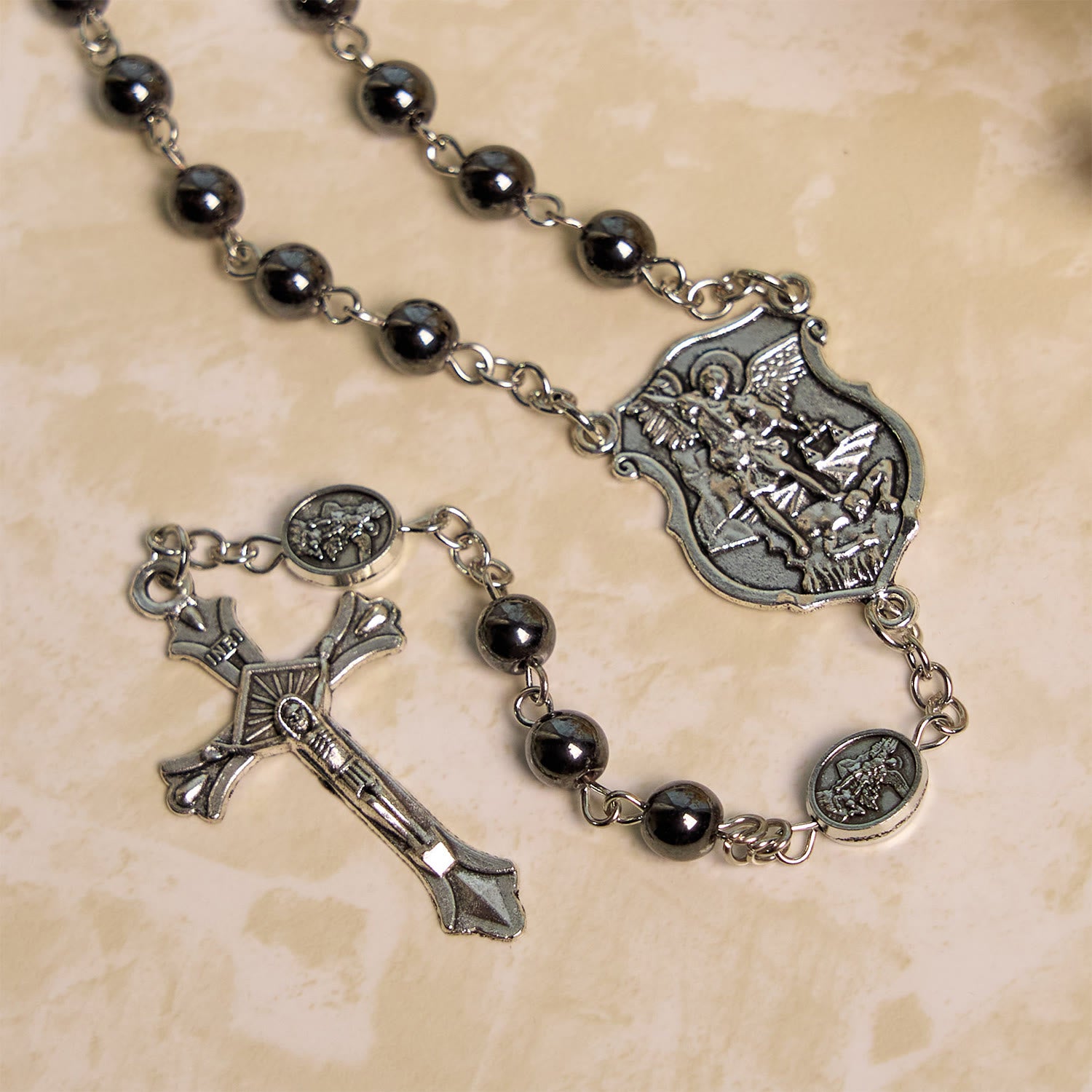 Shiny black beads pair with detailed St. Michael and crucifix charms. Meticulously made, it honors the archangel’s protective role, creating a steadfast faith accessory. -