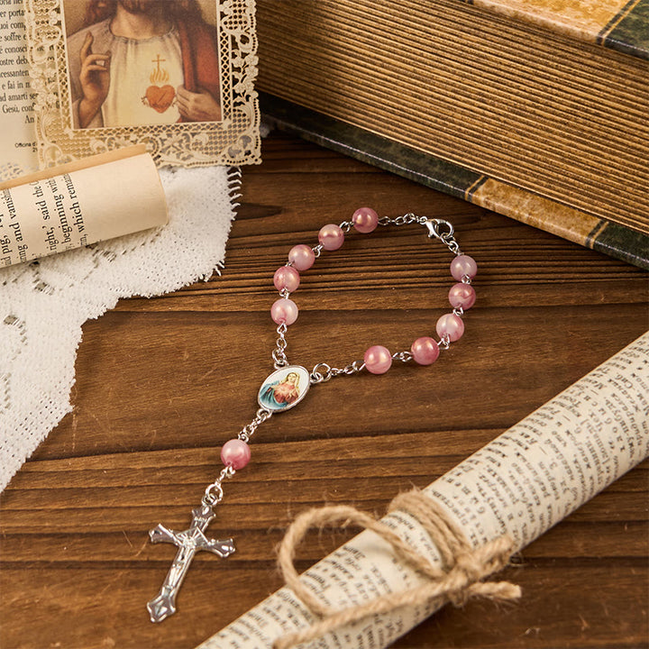 Immaculate Heart of Mary of 8mm Round Pink Alloy Chain Rosary