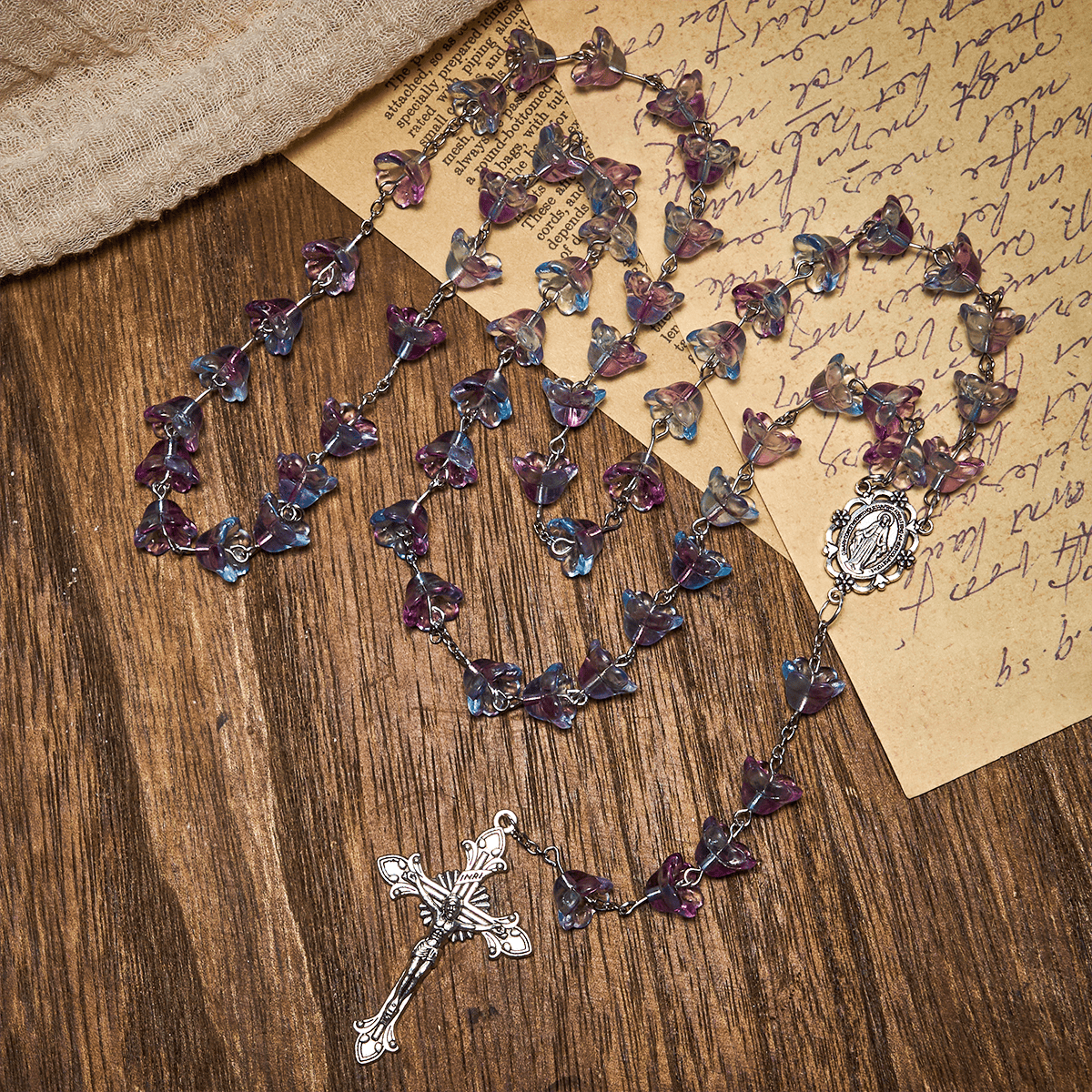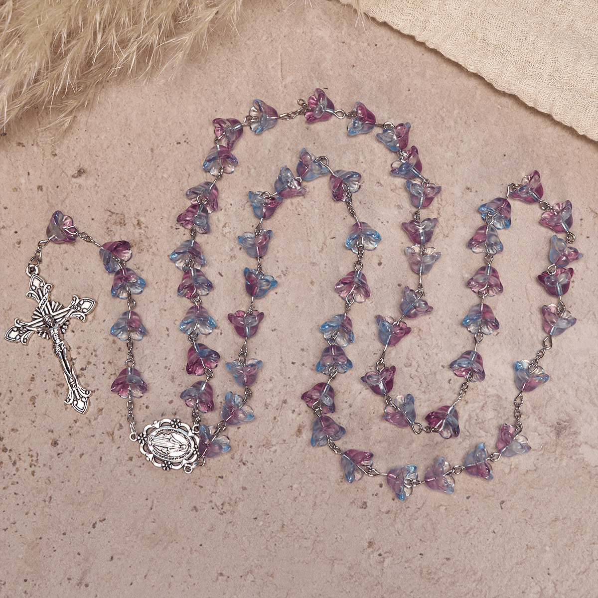This rosary drapes in translucent lily-of-the-valley blossoms—misty blue and soft violet like dew at dawn. A vintage Our Lady centerpiece and an elegant crucifix gather the decades into a gentle hymn of praise. -