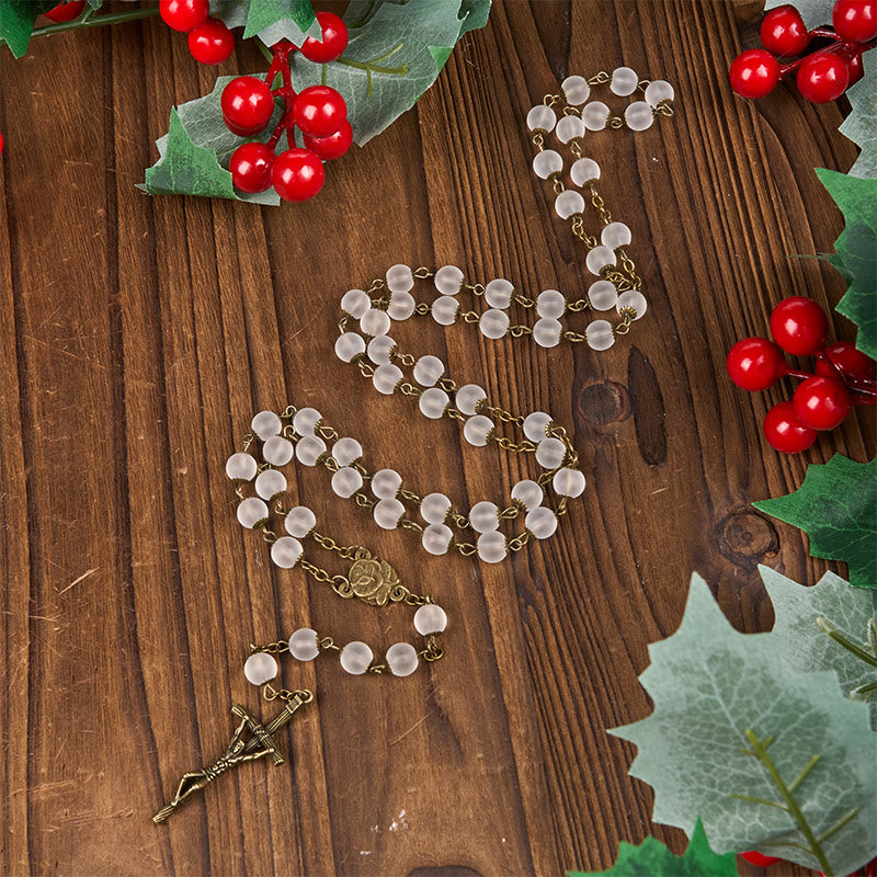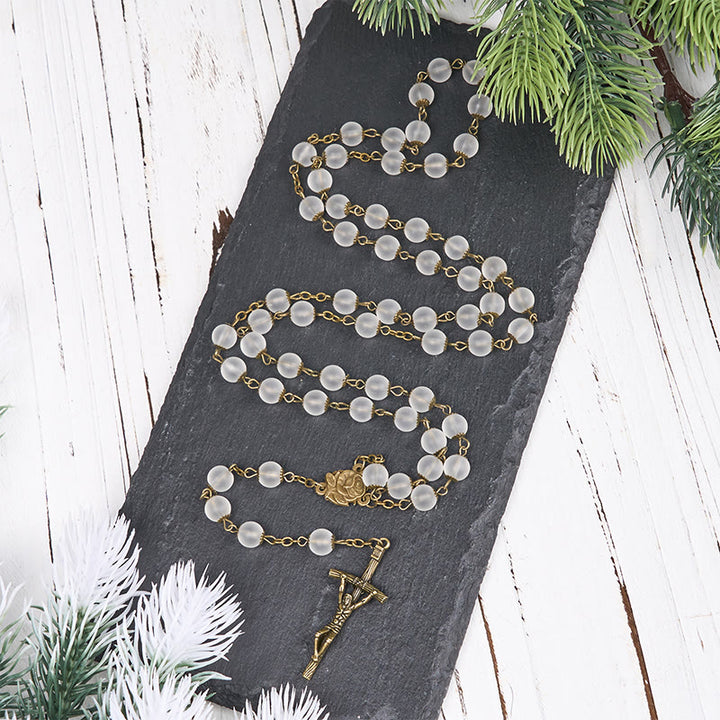 Enchanting Frosted Rose Beads: Each bead in this rosary is meticulously crafted into a frosted rose shape, offering a soft, serene glow. The frosted finish adds a touch of sophistication while symbolizing purity, devotion, and spiritual tranquility, enriching your prayer experience with deeper significance.