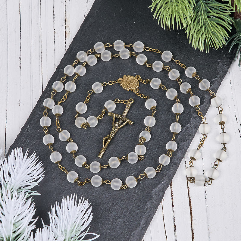 The frosted beads symbolize hope, divine light, and everlasting love, inspiring positivity and faithfulness in your spiritual practice. This rosary serves as a gentle reminder of the Holy Spirit's presence in your life, guiding you through times of prayer and contemplation.